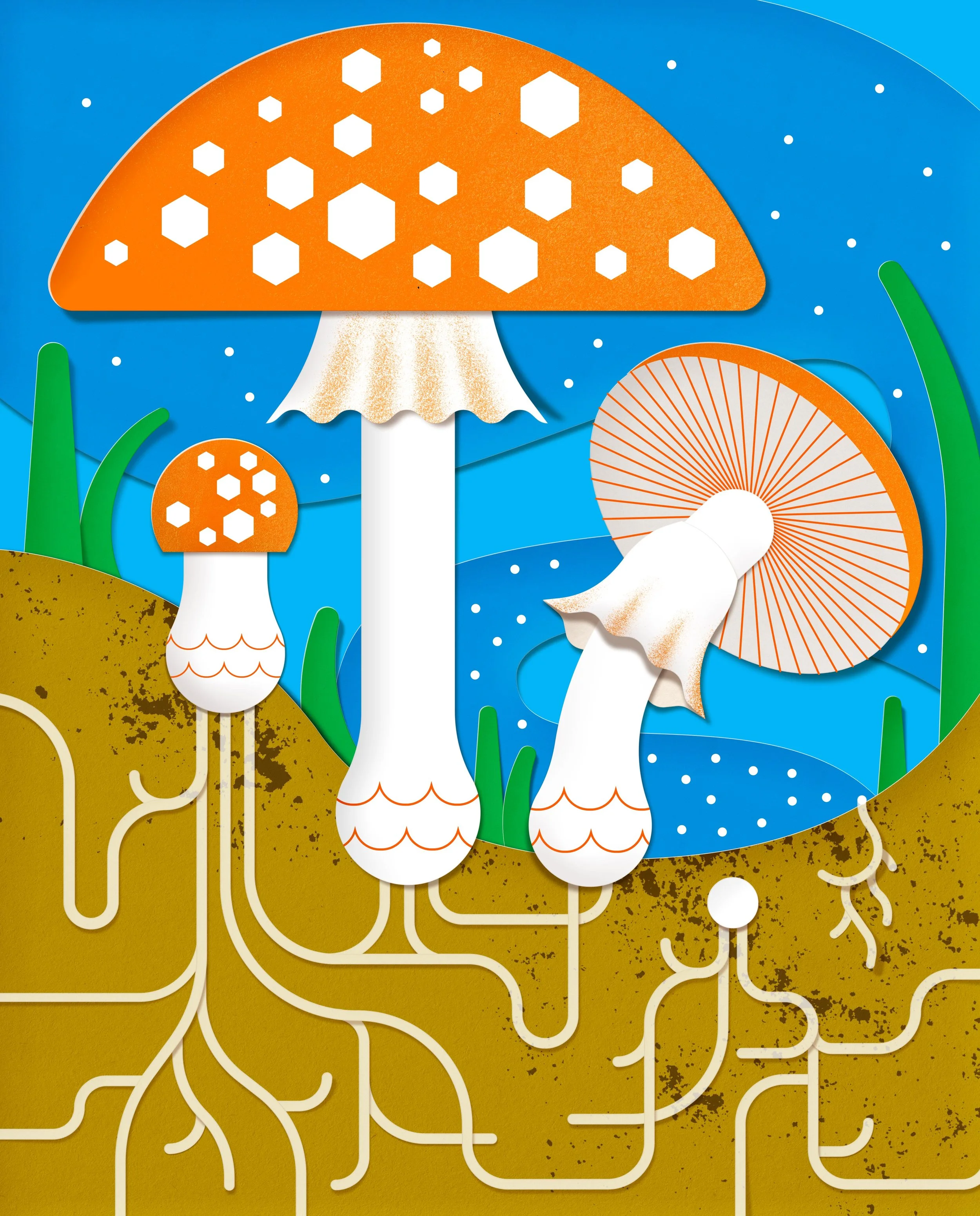 Mushroom life cycle Illustration of the fly agaric (Amanita muscaria) to show the stages of the mushroom life cycle.